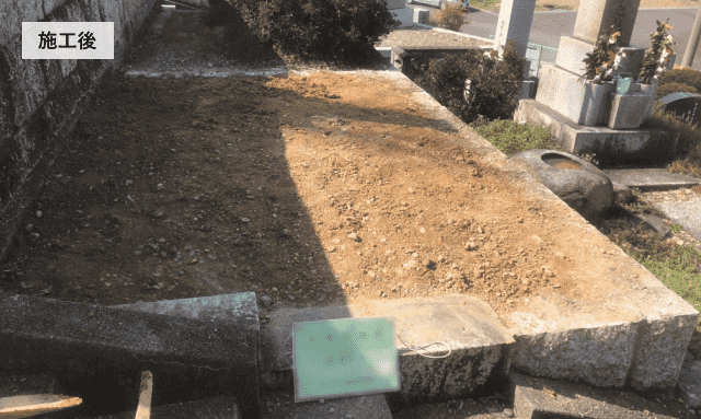 - 菩提寺さんのお墓をお終いにして現住所近くの共同墓地へ改葬される為にお問合せをいただきました。すでに他社さん3~4社で相見積中で改葬手続き済みで墓石撤去のみの御依頼でしたし、お客様が各所への連絡をてきぱきと進めて下さったので現地無料見積りから施工完了までスピーディーに進みました。 ご遺骨は菩提寺さんへお預けし、工事完成もお寺さんに確認していただき無事終了となりました。