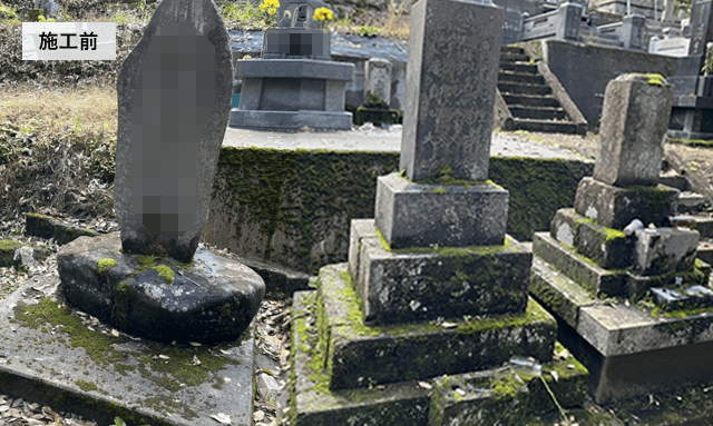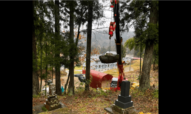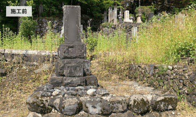 当初、他社様でお見積りをされていましたが、工事内容や費用がご希望に合わず、弊社にご相談頂きました。 山の中腹に位置する墓地で、急な階段や斜面がある墓地なので、作業機械を入れるための養生作業に1日かかる難所でした。 年末にご相談頂きましたが、処分費の高騰により雪解け後の工事になると費用が値上がりするという状況の中、なんとか年内に工事をする為に、お寺さん、お客様、石材店さんの日程調整ではお天気(雪)との勝負でした。 工事は、一日中雨が降る中行いましたが、無事終えられました。大変な中ありがとうございました。