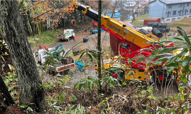 山道内にあるため、大型レッカー車を使用。